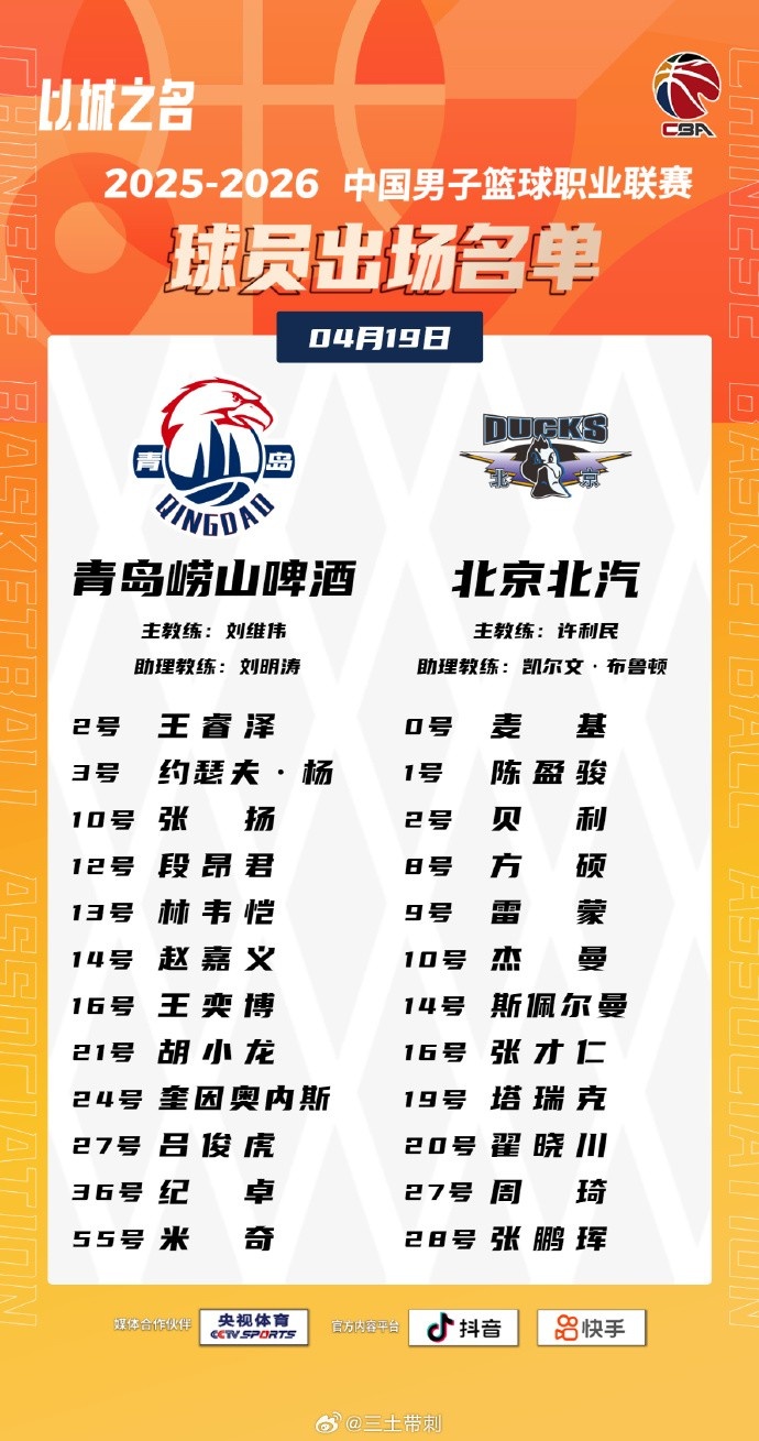 4月19日讯 今晚19:35CBA常规赛焦点战,青岛对阵北京。赛前双方公布了本场大名单: